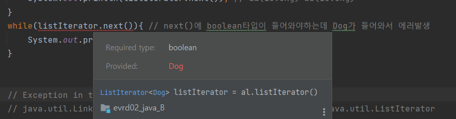 // hasPrevious()로 앞으로 돌렸기에 기준점이 앞으로 와있어 hasNext() 다시 작동