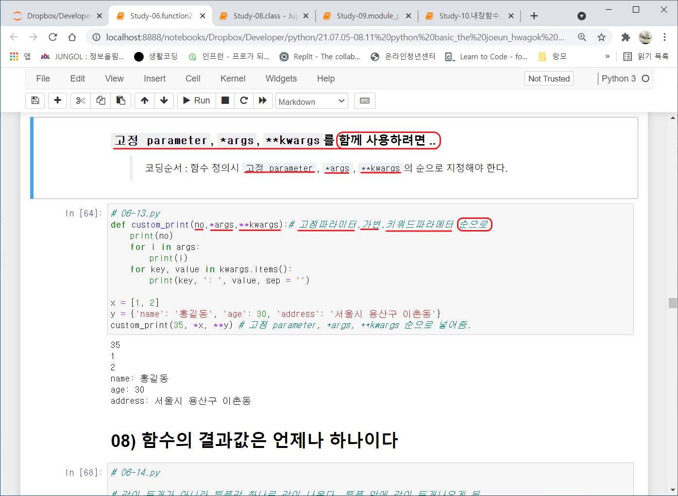 키워드 매개변수로써 첫째줄의 def의 매개변수 자리에 들어가서 함수 def personal_info가 작동한다