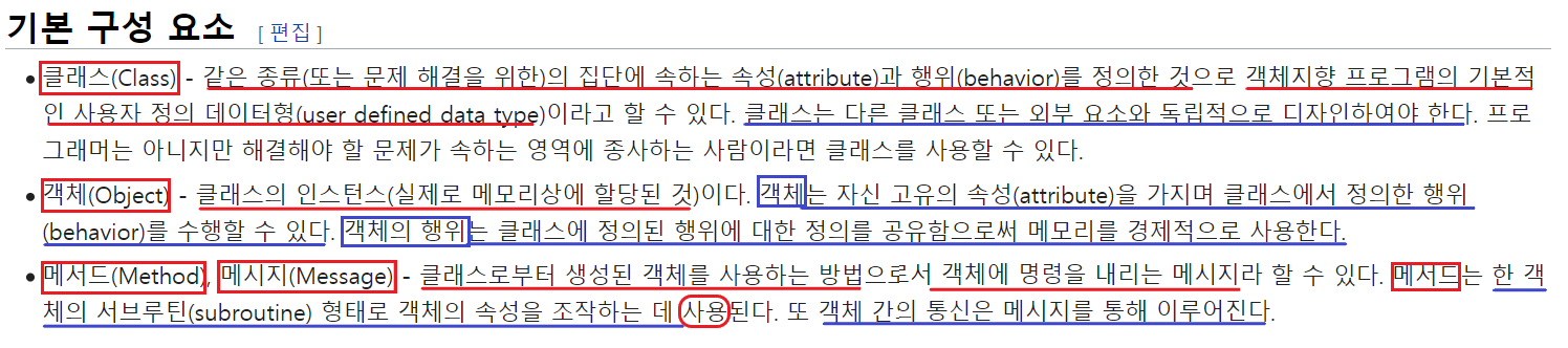 이제 '객체지향(Object-Oriented) 언어'가 무엇인지 이해하기 위해서는 먼저 기본 구성요소를 알아보자