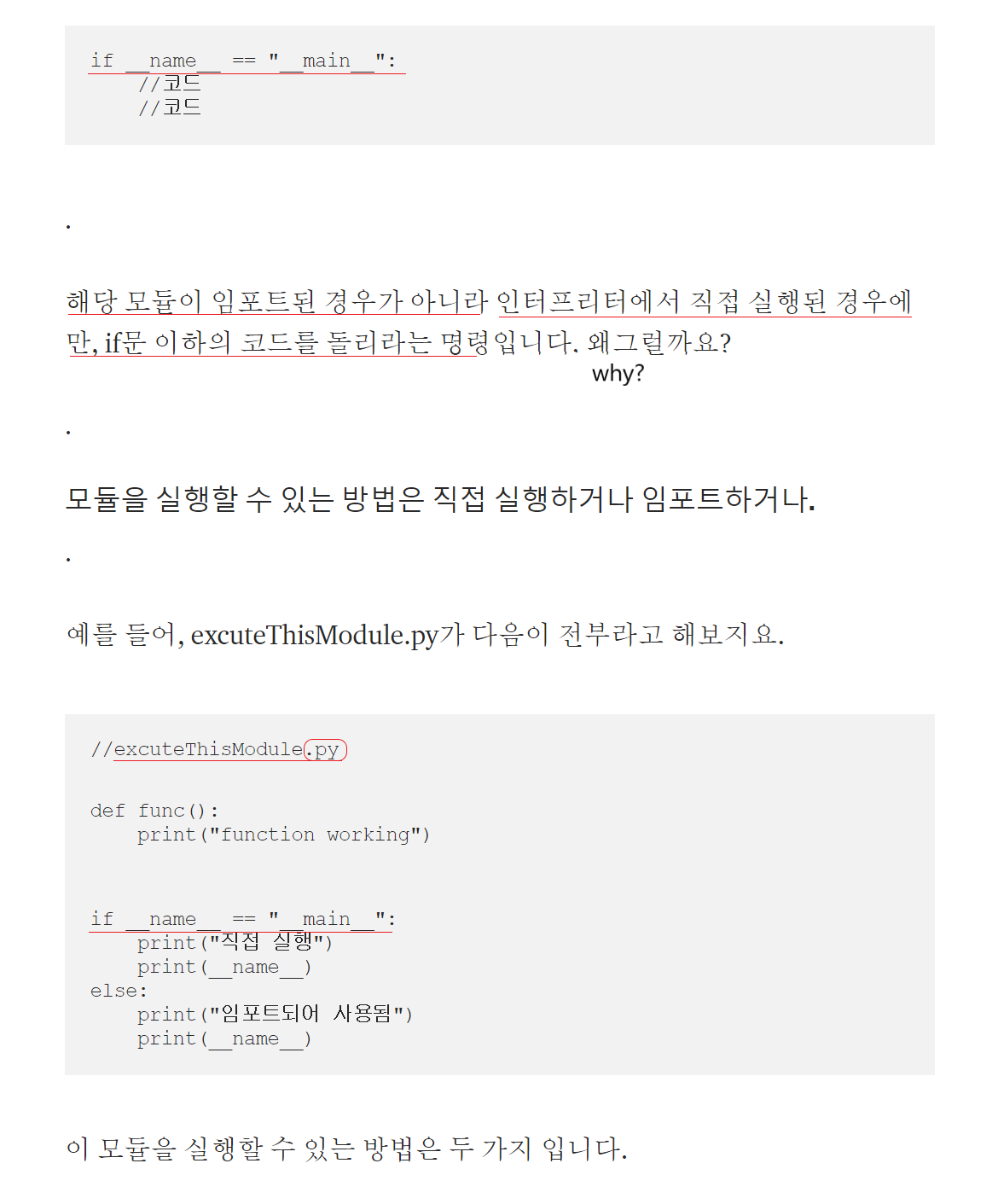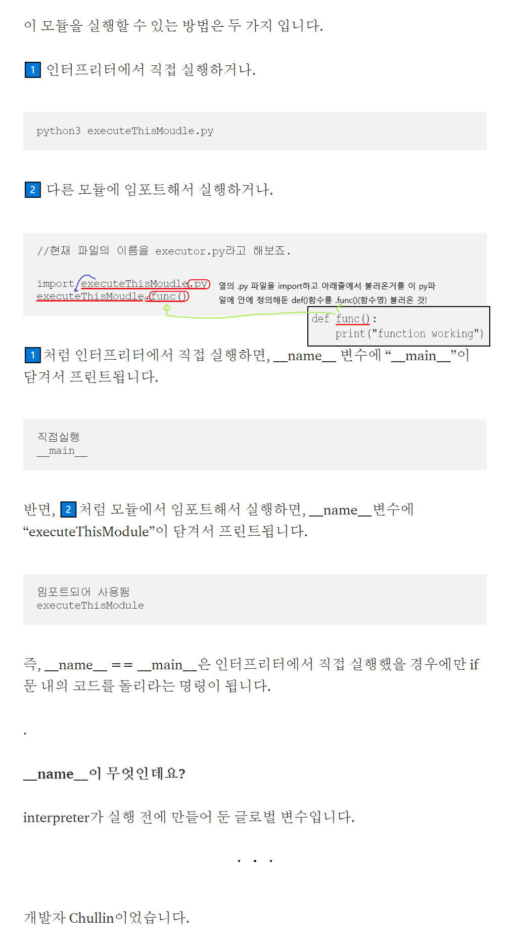 모듈을 실행하는 방법은 두가지인데, 인터프리터에서 직접 실행하거나 다른 모듈에 임포트해서 실행하던가이다.