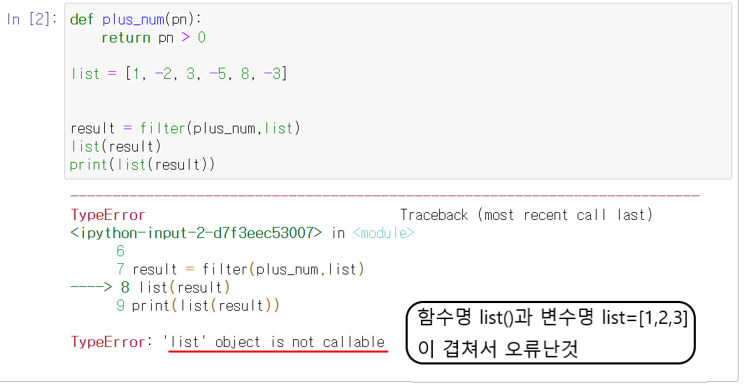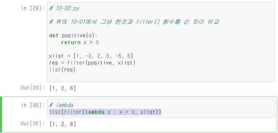- filter() 함수의 결과값을 list로 변환하는 가장 쉬운 방법은 list() 내장 함수를 사용하는 것.
