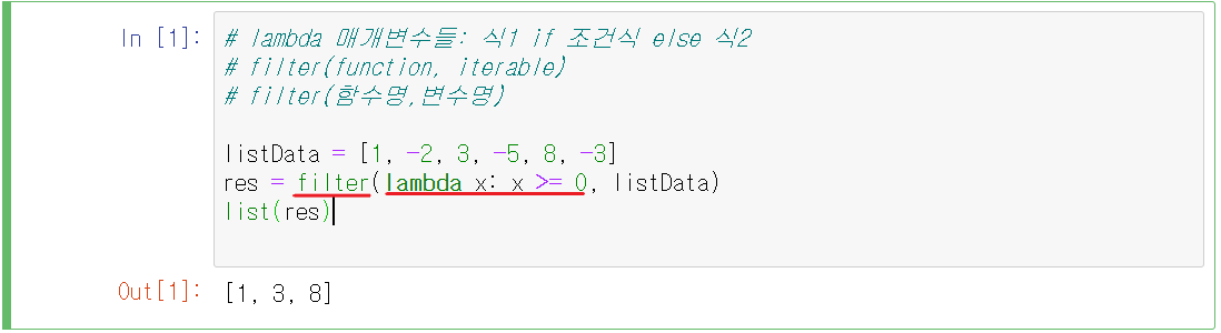 위의 filter() 함수식은 람다함수를 사용하면 더 간편하게 코드 작성가능