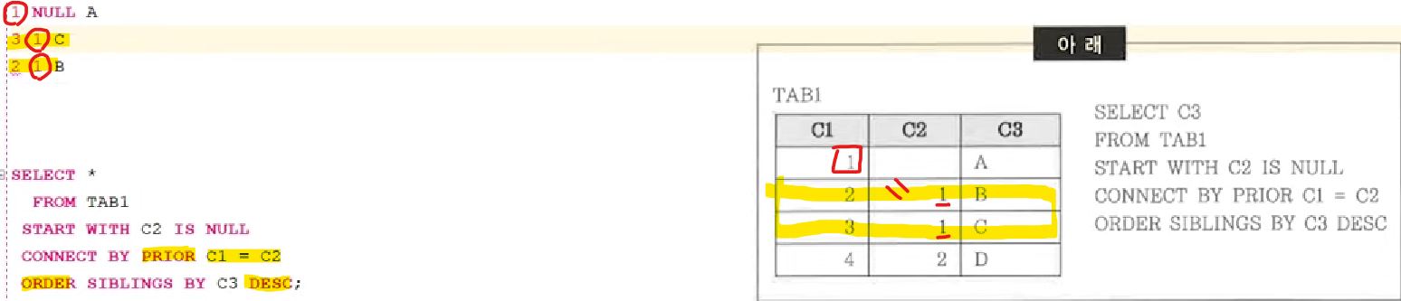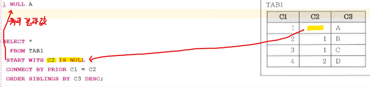 위의 start with에서 정한 계층구조 시작위치 구문에서 나온 row에서의 값과 PRIOR에 기준점으로 잡은 컬럼과 같은 값을 추출한다