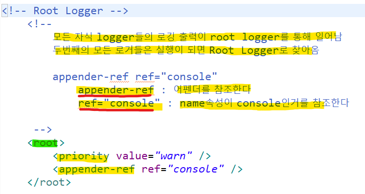 모든 자식 2번 <logger>들의 로깅 출력이 3번<root> root logger를 통해 일어남