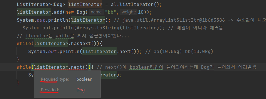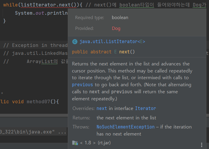 // hasPrevious()로 앞으로 돌렸기에 기준점이 앞으로 와있어 hasNext() 다시 작동