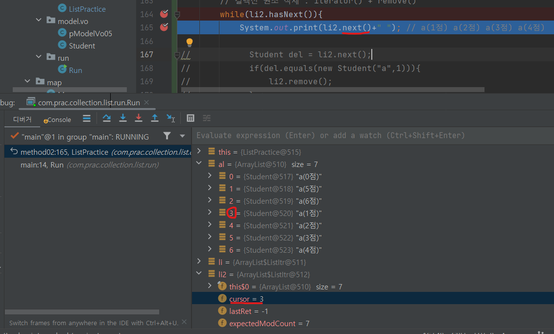 원데이터인 ArrayList인 al에 add하면 추가값이 잘 나오는데 ListIterator인 li2에 add하면 값이 while+hasNext()에서 안나온다. 근데 디버깅하면 안에 size도 그렇고 값이 추가된 것 같이 나오는데 이것저것 해봤지만 미스테리