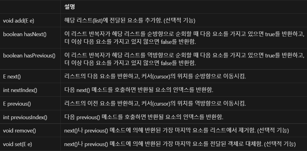 1.listIterator(int index) : iterator를 사용할 컬렉션의 해당 인덱스번호부터 값을 가져온다