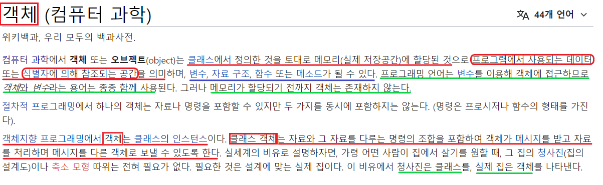 처음 기초 교재나 수업을 들어보면 객체라는 말을 안들어 볼 수가 없을 수가 없을정도 여러번 나오는 단어인데 정작 이 의미를 정확히 몰라서 해당 내용이 이해가 안되는 경우가 종종 있었다. 구글링해보면 객체에 대해서 여러 글들이 존재했지만 그나마 가장 이해가 됬던게 위키여서 자료로 남겨두었다.